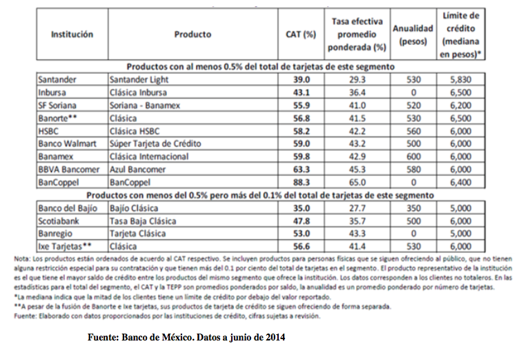 De acuerdo con información del Banco de México, al tercer trimestre de 2014, se tenía un registro de casi 29 millones de tarjetas de crédito vigentes en el mercado, incluyendo tarjetas titulares y adicionales, de las cuales el 64% fueron utilizadas en este periodo, es decir 18.4 millones de plásticos.