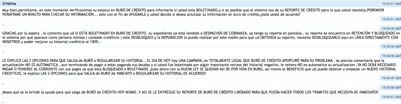 Ahora hagamos la prueba. Entramos a su chat en línea mediante el cual nos pidieron de entrada una serie de datos para -supuestamente- poder verificar nuestro estatus en el buró de crédito.