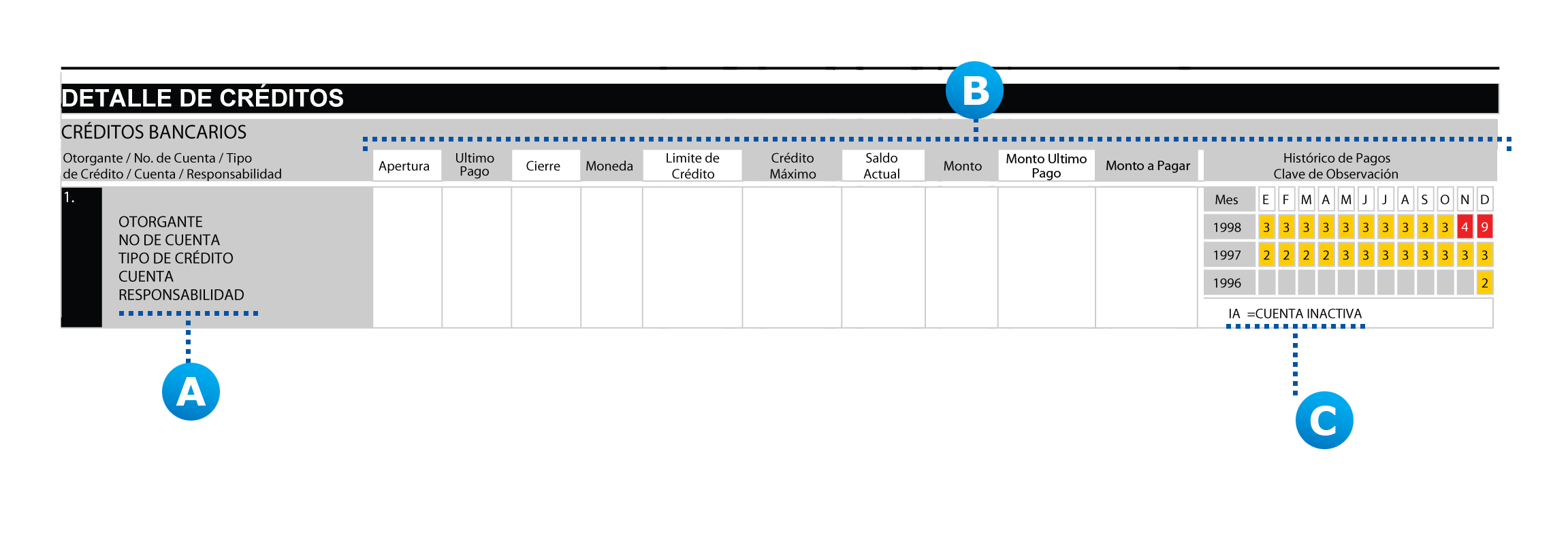 | Histórico de pagos | Se muestra mes con mes la forma en la que cumpliste con tu compromiso de pago. Podrás observar hasta 25 meses. El histórico va de 1 a 9:
