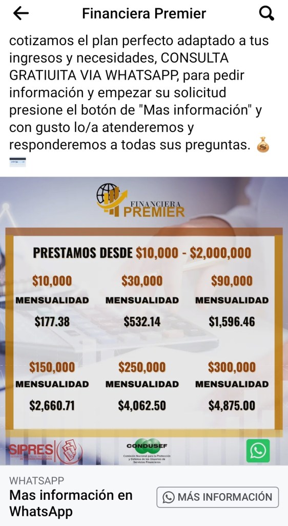 Se anuncian en redes sociales como supuestas financieras, ofreciendo atractivos créditos con condiciones maravillosas: pagos mensuales muy accesibles, plazos muy largos, intereses muy bajos, sin garantías ni avales y dicen que tampoco checan buró de crédito. Además, aseguran estar regulados por CONDUSEF y que incluso aparece su registro ante el SIPRES (Sistema de Registro de Prestadores de Servicios Financieros) y efectivamente, al ingresar al SIPRES la razón social de la financiera en cuestión aparece, todo se ve normal, pero, hay que checar los detalles…